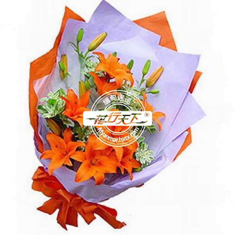 描述: 橙色百合8朵和绿叶组成、精美包装。